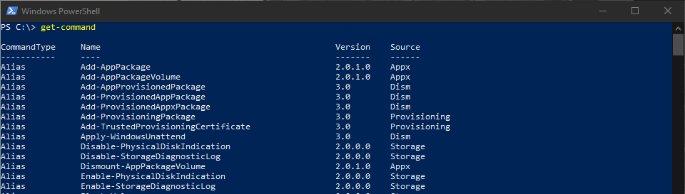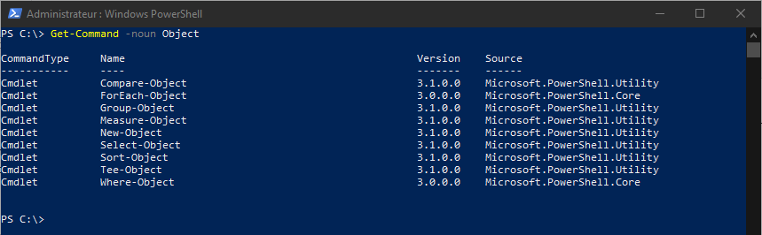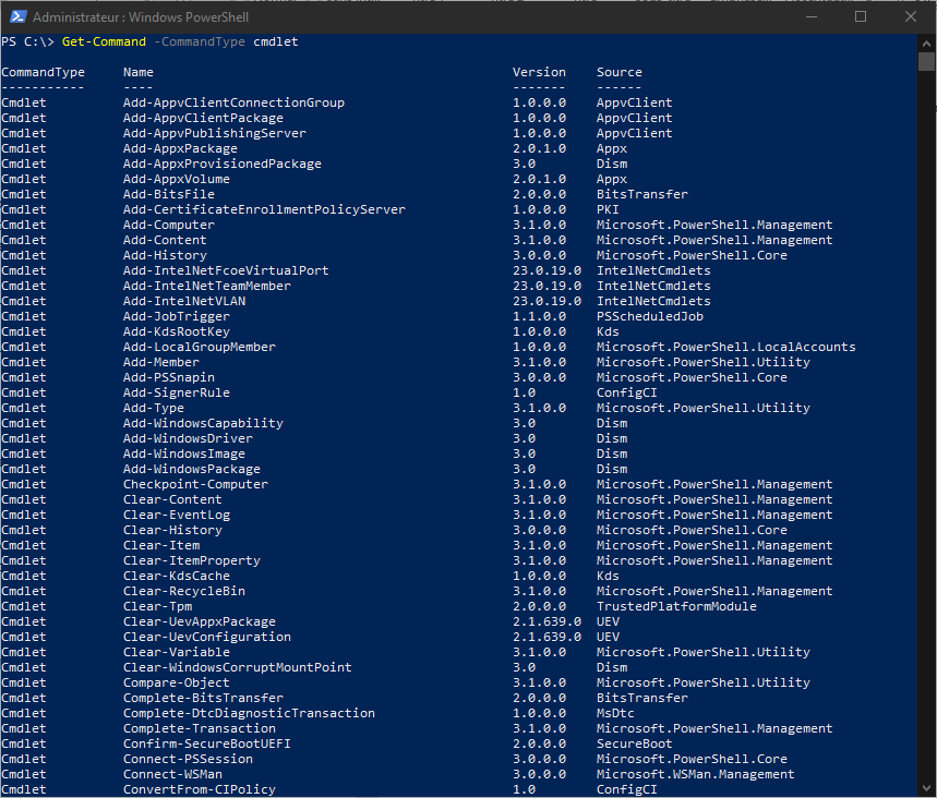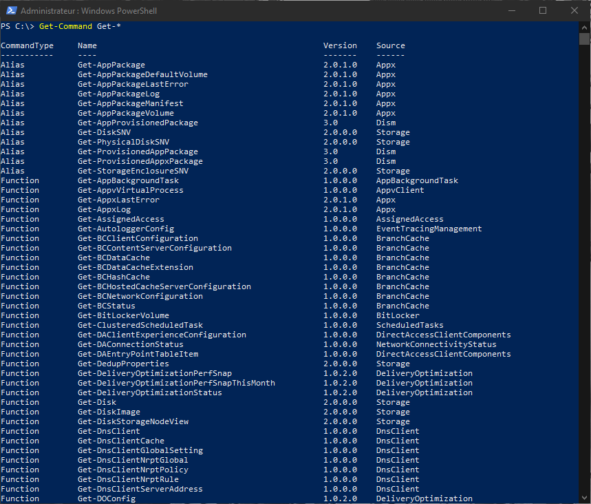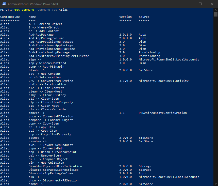 On comprend mieux qu’une des premières commandes à connaître et à retrouver en premier, c’est get-command qui permet de découvrir toutes les commandes Powershell. Sans préciser de paramètres, get-command retourne également les allias et les fonctions de la session.