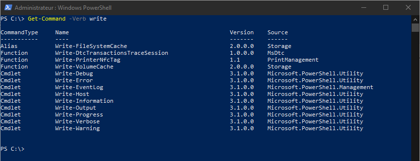 Comme vu plus haut avec verb, Get-Command possède le paramètre –verb et ce dernier permet de retourner toutes les commandes commençant par le verbe donné. Ici write.