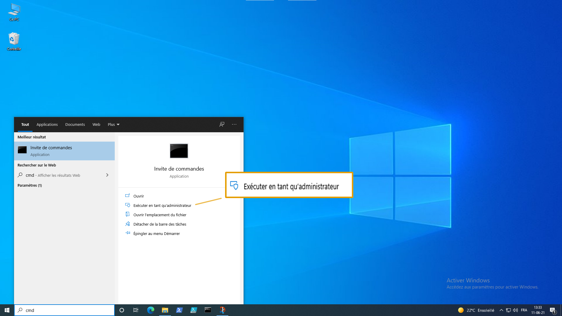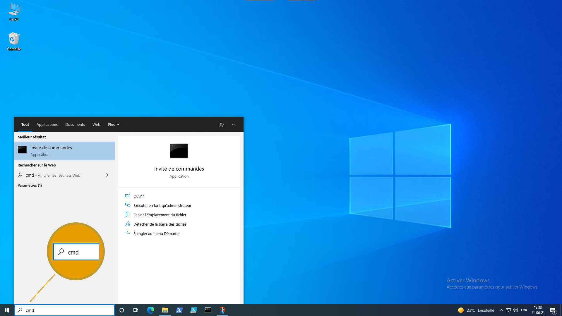 1.b Dans l’icône loupe, écrire cmd
