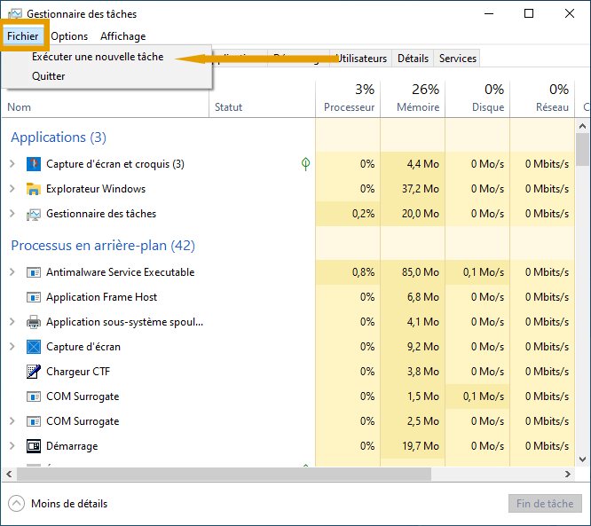 2.a Une fois dans le gestionnaire de tâches, allez dans fichier puis sélectionnez Exécuter une nouvelle tâche