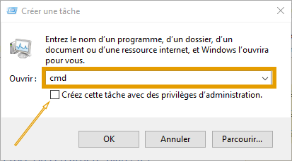 2.b Une fenêtre s’ouvre et vous propose de créer une tâche, indiquez dans le champ ouvrir : cmd et cochez « Créez cette tâche avec des privilèges d’administration. »