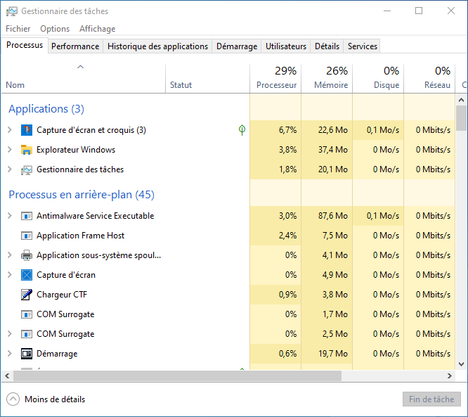 Ici nous allons ouvrir le gestionnaire de tâches, il existe plusieurs méthodes, soit via une commande « exécuter », soit via le menu démarrer en cliquant sur gestionnaire des tâches. Enfin on peut utiliser un raccourci clavier qui est « Ctrl+Maj+Esc » A vous de choisir la solution qui vous convient le mieux.