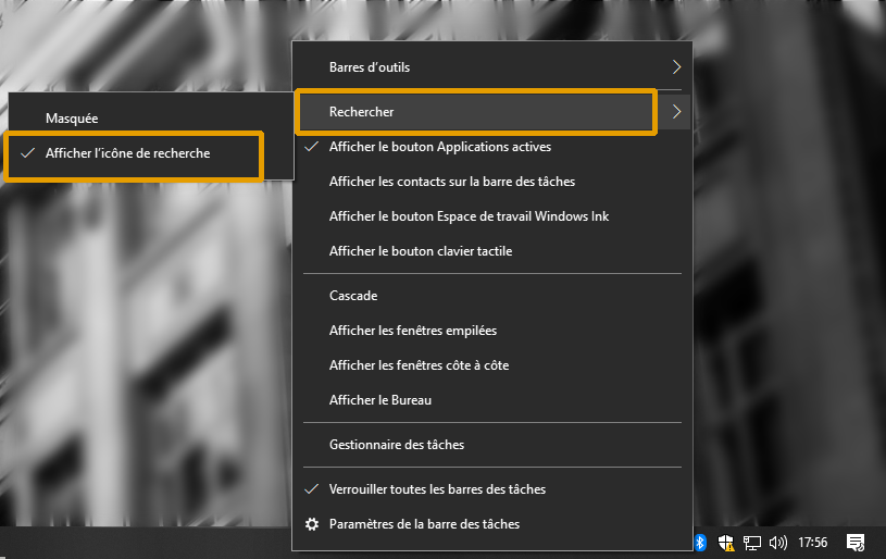 (Si vous n’avez pas cet icône, faites un clic droit sur la barre des tâches et sélectionner Rechercher > Afficher l’icône de recherche)