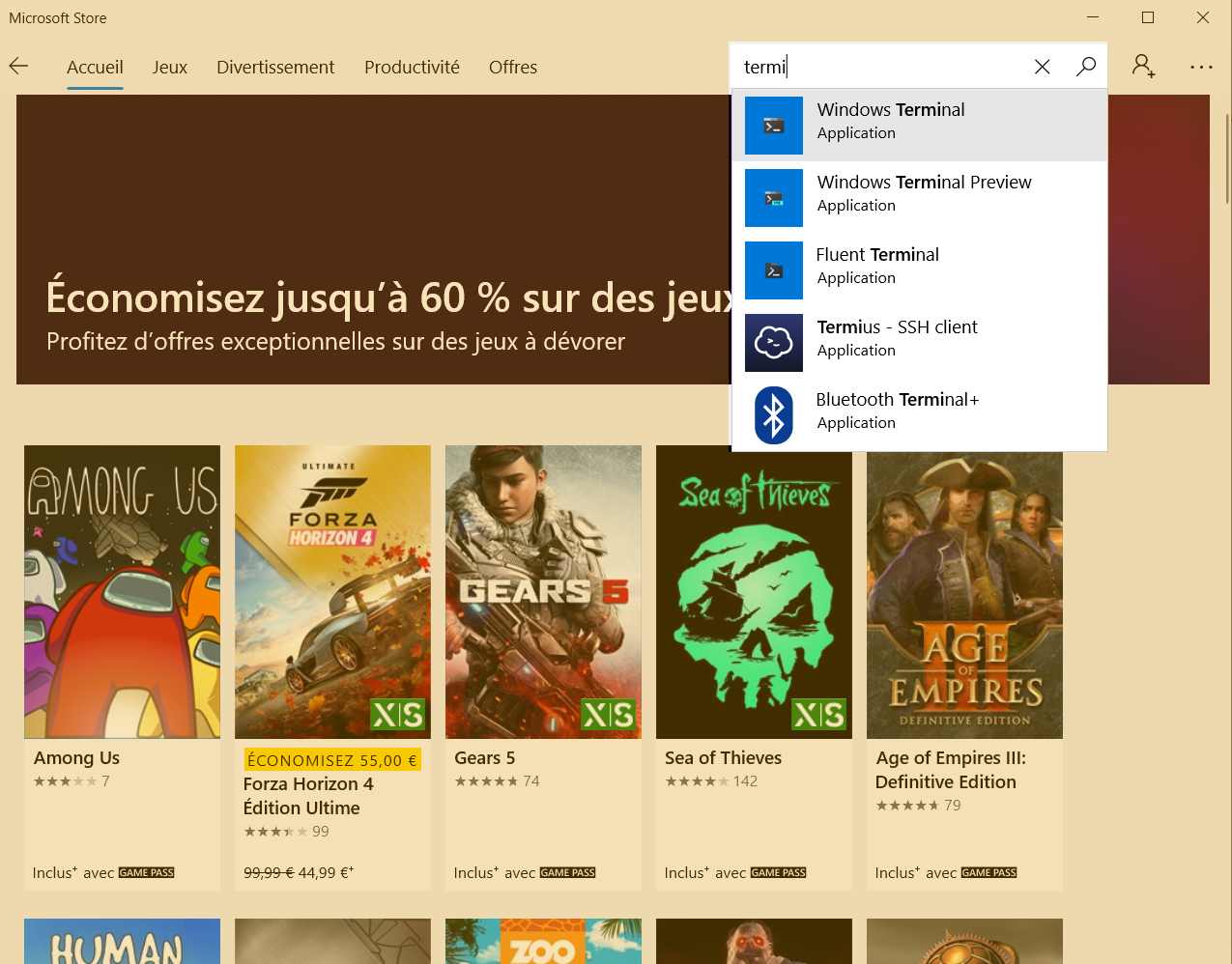 Une fois rendu dans le windows store, la méthode est relativement simple, il suffit de faire une recherche avec « terminal »