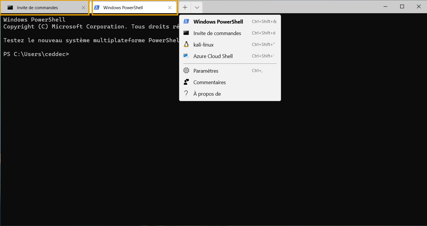 Lorsque l’on clique sur l’onglet « + » on rajoute une fenêtre Powershell car cette dernière est par défaut. C’est bien évidemment configurable. En allant sur le chevron vers le bas, on voit que l’on a accès d’autres paramètres. On ne va pas parler ici de l’onglet Kali Linux, car celui-ci demande une configuration spécifique au système.