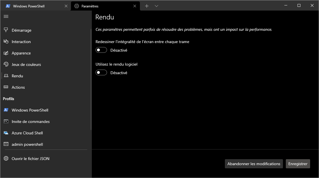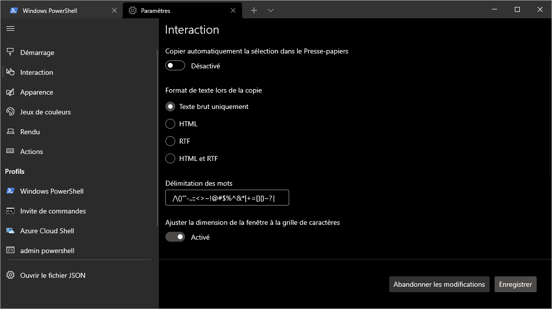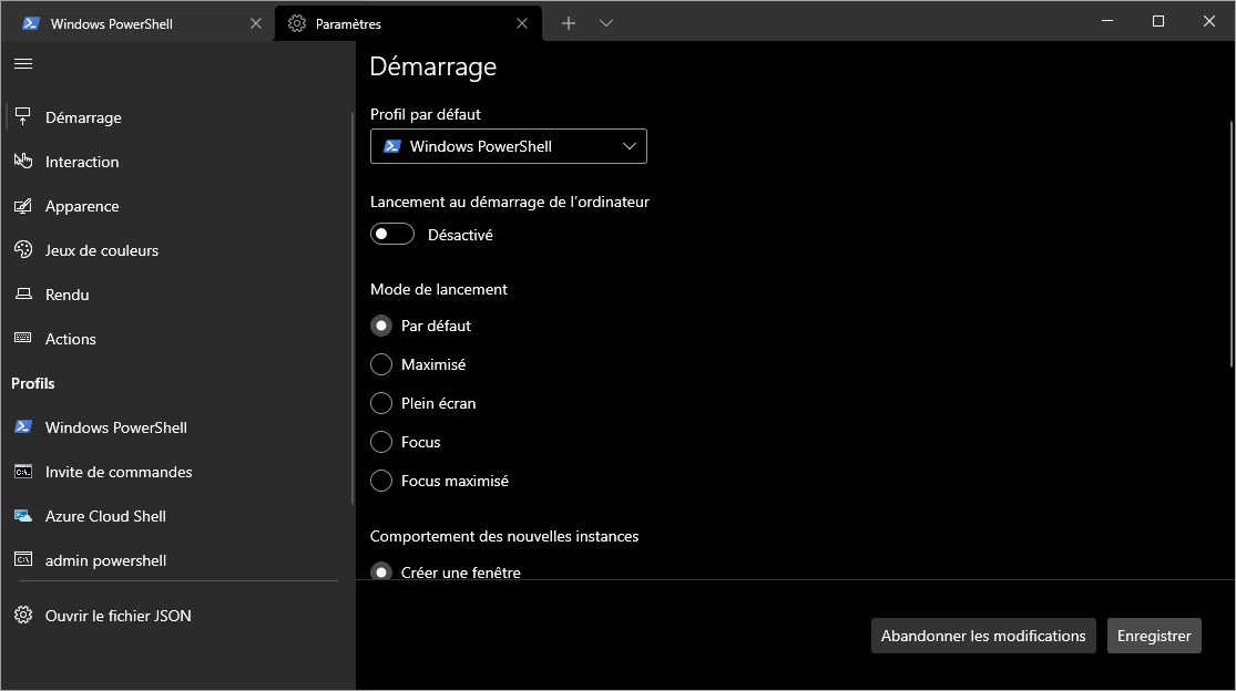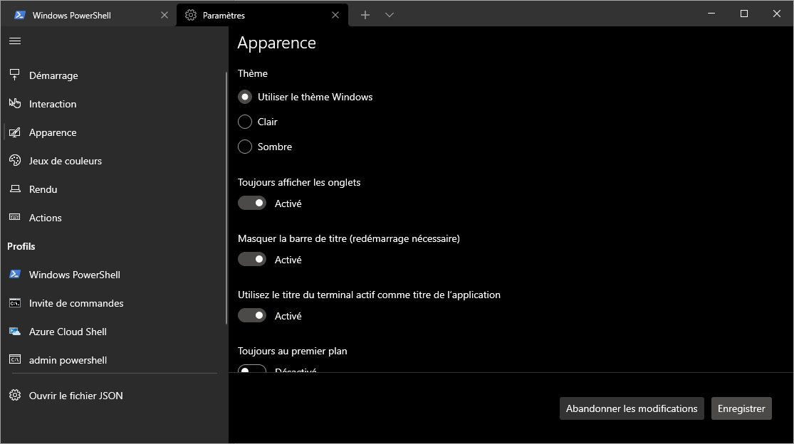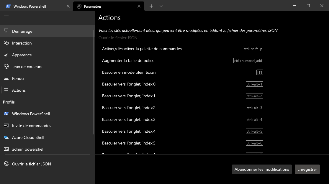 Ouvrir le fichier JSON : Pour aller plus loin dans la configuration, tous les paramètres se retrouvent dans ce fichier. On pourra notamment, en attendant que Microsoft intègre cette fonctionnalité, définir un profil sur un terminal Powershell pour qu’il s’active en mode administrateur directement.