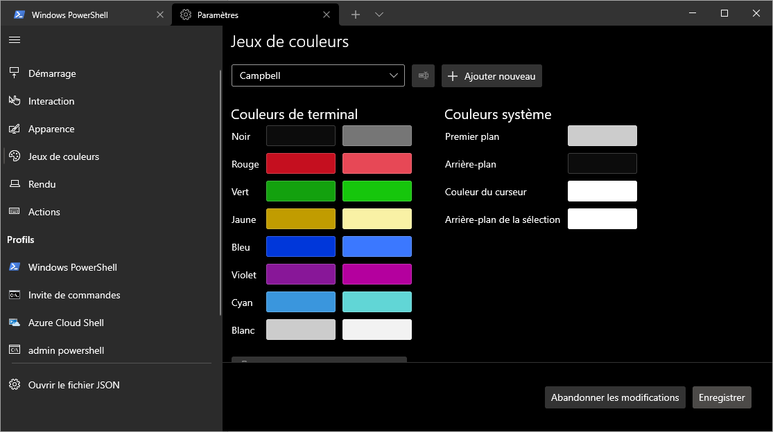 Jeux de couleurs : défini les couleurs utilisées par Windows terminal comme le fond, le texte etc…